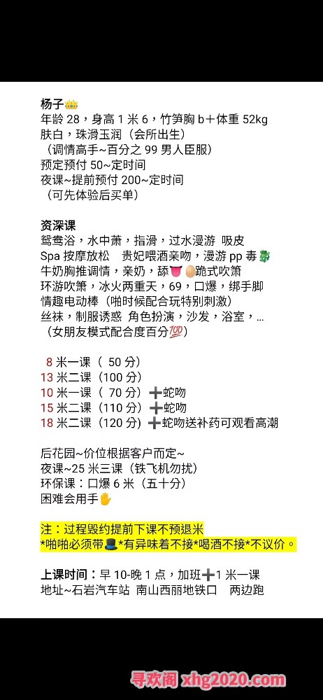 凡是有要求路费/定金/保证金/照片验证/视频验证等任何提前付费的行为,千万不要上当。同时也请注意仙人跳,在寻欢前不要露富和带过于贵重随身物品。本站为分享信息并不对寻欢经历负责,碰到有问题的信息,请及时举报给我们删除信息。